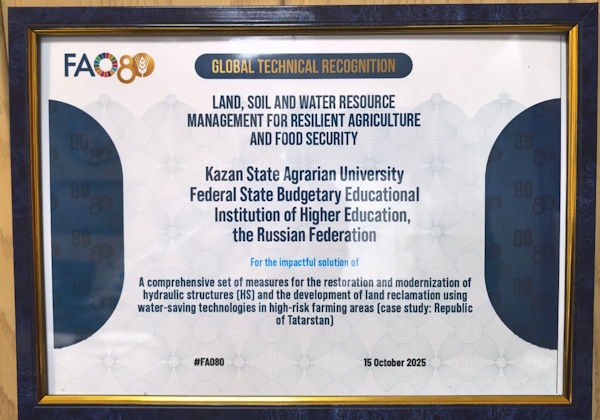На церемонии были отмечены 39 организаций со всего мира, добившихся выдающихся результатов в преобразовании агропродовольственных систем. В числе лауреатов — Казанский государственный аграрный университет, чей масштабный проект, реализованный с мелиораторами республики по развитию мелиорации в Республике Татарстан, был удостоен глобального признания.