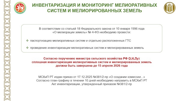 «Одна из основных задач, установленных Минсельхозом России и федеральным законом „О мелиорации земель“, проведение сплошной инвентаризации мелиоративных систем. Для этого издан приказ и Начальники Управлений совместно с профильными отделами Министерства назначены ответственными за данную работу. Коллеги, прошу очень ответственно подойти к вопросу» — завершил свое выступление зампредседателя Правительства РТ.