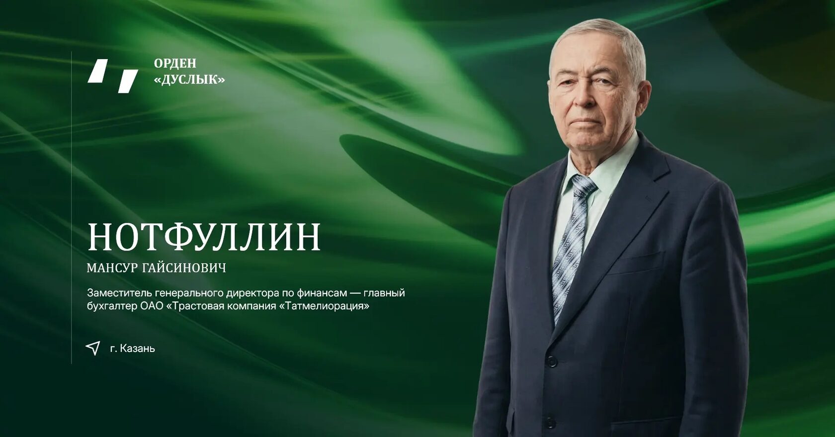Среди награжденных и представители мелиоративной отрасли. Так, Орденом «Дуслык» награжден заместитель генерального директора по финансам - главный бухгалтер ОАО «Трастовая компания «Татмелиорация» Мансур Гайсинович Нотфуллин.
