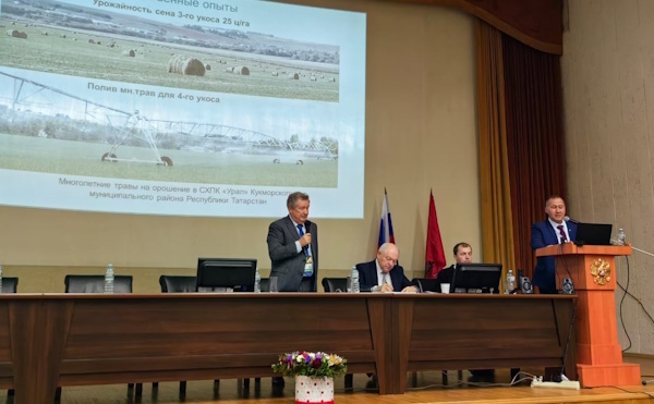 Он ознакомил участников конференции о приоритетных направлениях научных исследований инновационного развития по агрохимической и гидромелиорации, а так же производством современных широкозахватных дождевальных машин «Казанка». Данные машины позволяют поливать все виды сельхозкультур и имеют специальные насадки, формирующие мелкодисперсный дождь, что обеспечивает равномерность полива. Есть возможность реверсного движения — машина может передвигаться как по часовой стрелке, так и в обратном направлении, регулировать и чередовать полив с учётом размещения на участке разных культур. Применение современных способов защиты конструкции от коррозии путем горячего цинкования позволяет вносить удобрения и животноводческие стоки вместе с поливной водой.